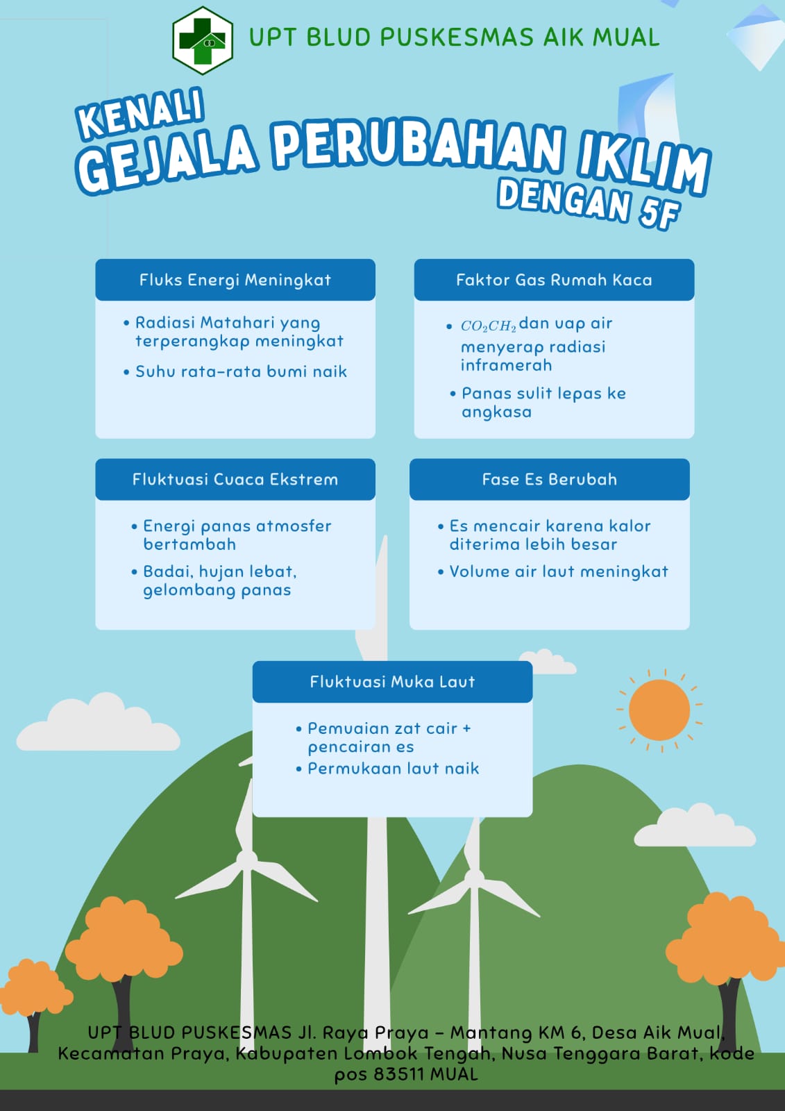 Puskesmas Aik Mual mengimbau masyarakat untuk tetap waspada, terutama bagi warga yang tinggal di daerah rawan banjir, bantaran sungai, dan wilayah perbukitan. Masyarakat juga diharapkan untuk mengamankan barang-barang di sekitar rumah, memangkas pohon yang berpotensi tumbang, serta menghindari berteduh di bawah pohon saat hujan disertai angin kencang.